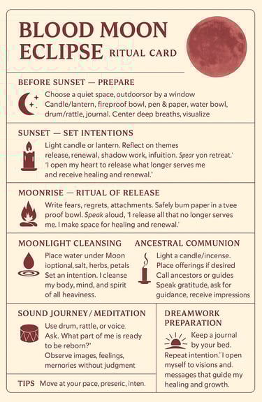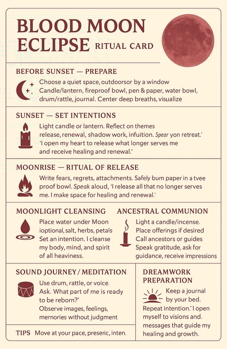 This crimson Moon invites surrender: release what is heavy, honor what has passed, and open to renewal. Step outside. Feel the pulse of Earth beneath your feet, the rhythm of Spirit in your chest. Let your breath carry prayers of release. Let your heart receive visions of becoming.